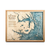 Gorgeous Outer Banks 3D Nautical Wood Chart Map—it's like gallery-level art, but better! Thanks to cool tech and old-fashioned craftsmanship, the charts are laser engraved with intricate detail onto Baltic Birch and expertly stained and assembled. It's a 24" x 30" frame with 4 levels of depth and a heavenly blue-green hue. All 🇺🇸 Handcrafted!
