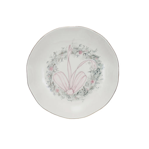 View full detailsAdd a touch of whimsy to your table with this Stoneware Bow Bowl. Featuring a pastel pink bow perched atop a festive wreath and a gleaming gold ele...