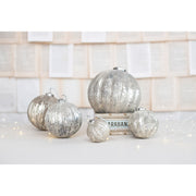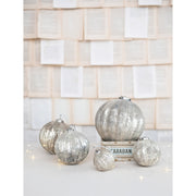 These unique ornaments feature a 3" round ball with a distressed silver finish. The ornament itself is embossed and flocked with a bit of glitter and seed glass.