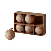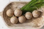 The Pip Kraft Ornament set includes six light weight paper mache ornaments in natural brown with a printed motif of Pip the Mouse in white. The set is packaged in a chipboard box with lid for storage.