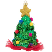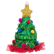 With tinseled cone, pom pom ornaments and a tulle skirt, this glittered tree is joyful from top to bottom.