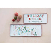These fun enameled metal trays feature two festive sayings to brighten up your home! Pick from two designs each come in a different size.