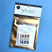 Individually printed & pre-cut for easy application 🤩. Simple instructions on the back of each tattoo card. Premium metallic foils, color inks, and adhesive - wears 2-6 days with proper care ✅. Non-toxic & safe for all ages 🙌, but not for kiddos under 3 🚫. Packaged in a shiny metallic pouch with 2 Flash Off™ remover wipes for free 🤩!
