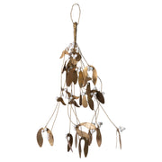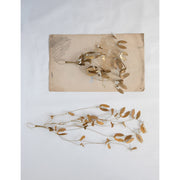 Gold leaves and white beads hang on strands of wire to create this decorative hanging swag. Hang it on a wall or fill out bare spots in a Christmas tree by inserting the handle part first allowing just the leaves and beads to be seen. It can also be turned upside down and displayed in a decorative vase.