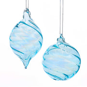 Enjoy the holidays with these glass ice blue swirl ornaments! You can select from a ball and finial style option. Each ornament contains a detailed swirl pattern.