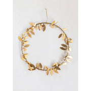 A familiar holiday style to add to your collection this year. This antiqued brass wreath features a neat collection of leaves and berries around a mid size metal ring adorned with glass beads.