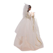 This Kurt Adler ivory and gold angel treetop is a fun and festive way to add to your holiday decor. This angel is wearing an elegant ivory and gold gown. Her dress is decorated with gold ribbons and her wings are ivory and resemble traditional feather- like angel wings.
