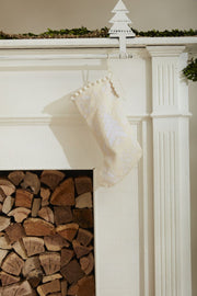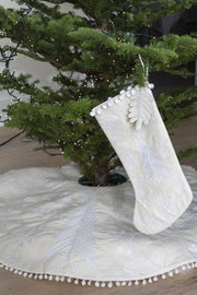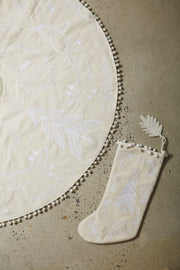 The Wynter Stocking captures the beauty of freshly fallen snow and has a cream white background with delicate tonal embroidery. Small white pompoms trim the top of this luxe Christmas stocking and an embroidered winter leaf hangs from the stocking's loop. Pairs perfectly with our Wynter Tree Skirt.