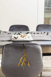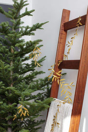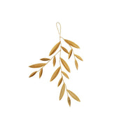 Cut from brilliant gold sheet metal, the Amulet Ornament is a gold Christmas ornament with delicate flexed leaves. The ornament can be gently shaped and used on a tree, as mistletoe, or even layered with a place setting. A gold wire loop holds the ornament in place.