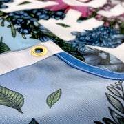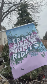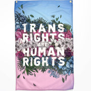 This gorgeous, lightweight outdoor flag features a message of empowerment: "Trans Rights Are Human Rights", cleverly framed by flowery illustrations atop the iconic transgender flag's light blue and pink hues. Crafted from knitted polyester fabric, the design is printed single-sided and appears as a mirrored image on the back, with 50–60% visibility. 🌈☀️ 🌈 Illustrated by Rae Senarighi.