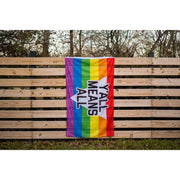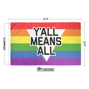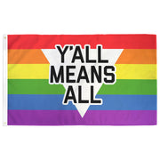 A white triangle and the words "Y'ALL MEANS ALL" centered on top of the traditional six stripe rainbow pride flag.