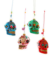 On Dia de los Muertos, it is traditional to gift small sugar skulls, or calaveras de azucar. They are eaten by the living or left in personal altars for the dead. These brightly colored skulls are examples of the beautiful decorations done to these skulls. Collect all 4 colors!