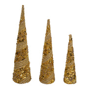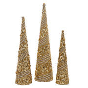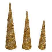 These small, medium and large cone tree table pieces are a festive addition to any home or office holiday décor. Each cone tree features a gold ombré tree with gold sequin, bead, glitter and clear gemstones.