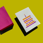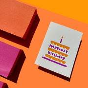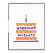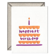 Celebrate another trip around the sun in style with our Happiest Birthday Layer Cake Card! This colorful card features a whimsical candle atop a delicious-looking layer cake in orange and pink. It's the perfect way to add a touch of fun and sweetness to any birthday celebration. Letterpress printed on antique machines (one color at a time!), and assembled by hand in South Carolina, USA.
