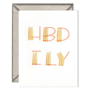 Say "Happy Birthday I Love You" in a unique and playful way with our HBD ILY Card! This simple yet bold design features handwritting-like letters that will surely bring a smile to your loved one's face. Show them how much you care with this quirky and fun card.