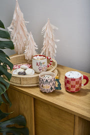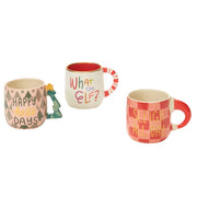 Celebrate the season with the Kitschy Christmas Mug Collection. This collection includes three distinct styles. Choose from a red and pink checkerboard pattern with "SLEIGH ALL DAY", a pink and green tree pattern with "HAPPY HOLLA DAYS", or a white speckled base with "WHAT THE ELF?". Each mug makes a delightful holiday gift, especially when paired with a small drop-in plant or a bag of coffee.
