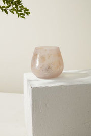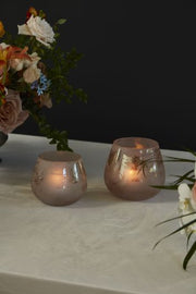 This votive features a unique color combination. Overall it is pink but has patches of mercury glass-like elements that appear gold when a candle is lit. Overall, a very fun votive to feature in your home.