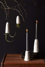 The Phantom Candleholder is a spooky ceramic taper candleholder that helps set the mood for a Halloween party. Each one holds a standard taper candle and looks best paired with friends.