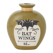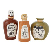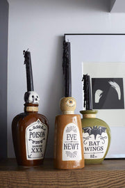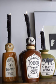 The Spell Potion Candleholder is playful take on a witch's cabinet staple ingredients. Ceramic figurines full of Bat Wings and Eye of Newt have taper candle openings at the tops for a drippy wax candle to rest in.
