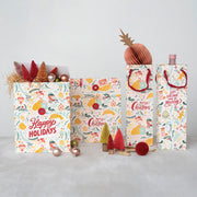 Add some festive flair to your holiday gifting this year with these recycled paper bags! Your recipient will receive their gift with a special dose of holiday cheer, featuring two fun styles for yuletide merriment. "Merry Christmas" and "Eat, Drink, and Be Merry" - cheers to a greener holiday season!
