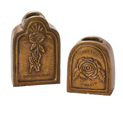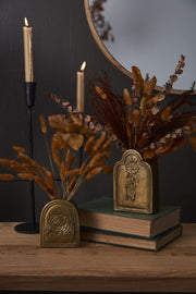 Bring a bit of delightful dread to your Halloween decor with the Til Death Budvase Collection. These recycled cast aluminum tombstone-shaped budvases feature intricate, dimensional designs—a skeleton hand holding a rose with the phrase "memento mori", and an eyeball inside a rose with the phrase "love you to death." Each budvase is perfect as a vessel for a few dried or fresh stems and serves as a spooky decorative object that can be layered together. Sold Separately